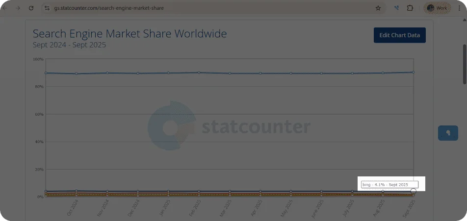 As of 2025, Google holds about 90.38 percent of the global search engine market across all devices, including desktop, mobile, and tablet, according to StatCounter Global Stats.